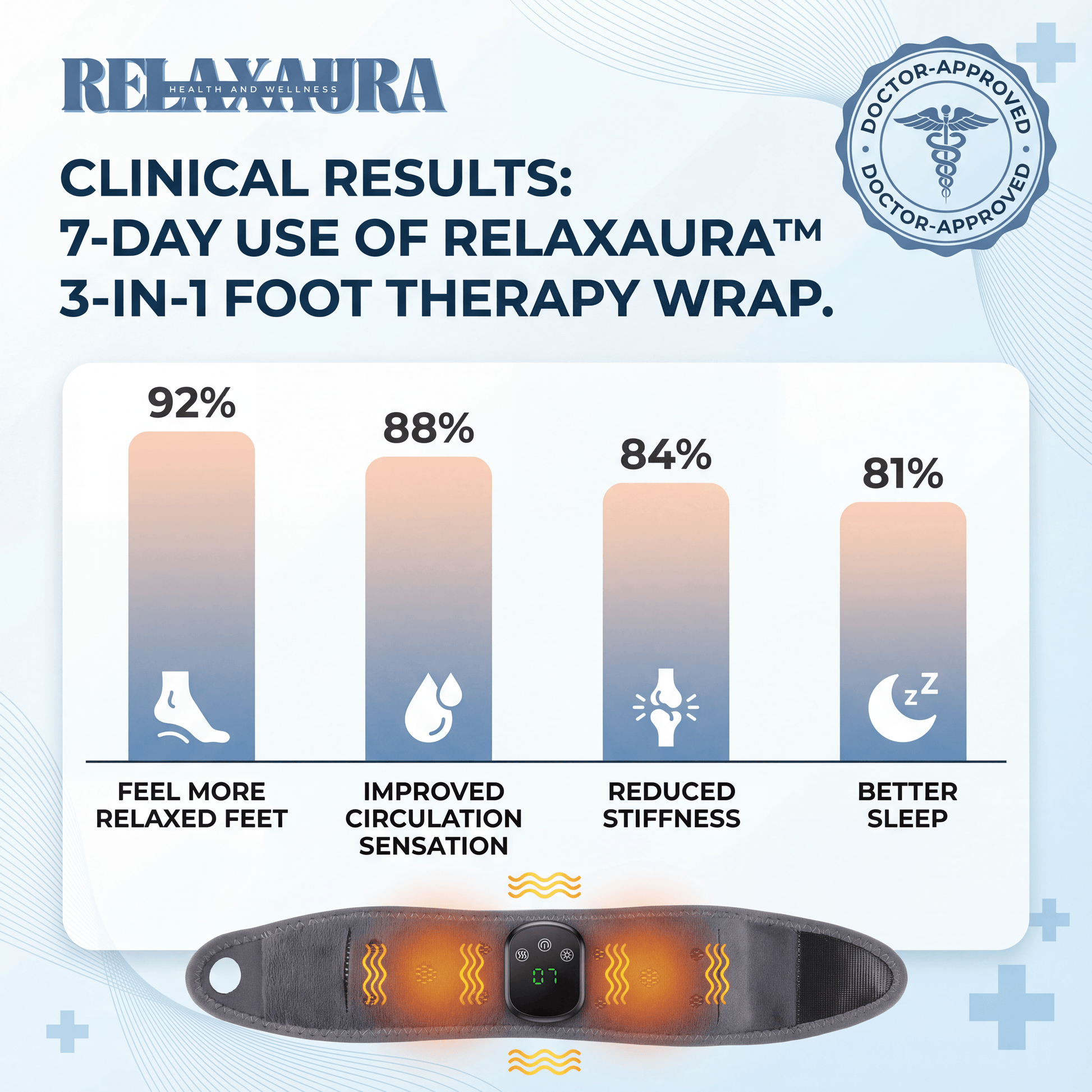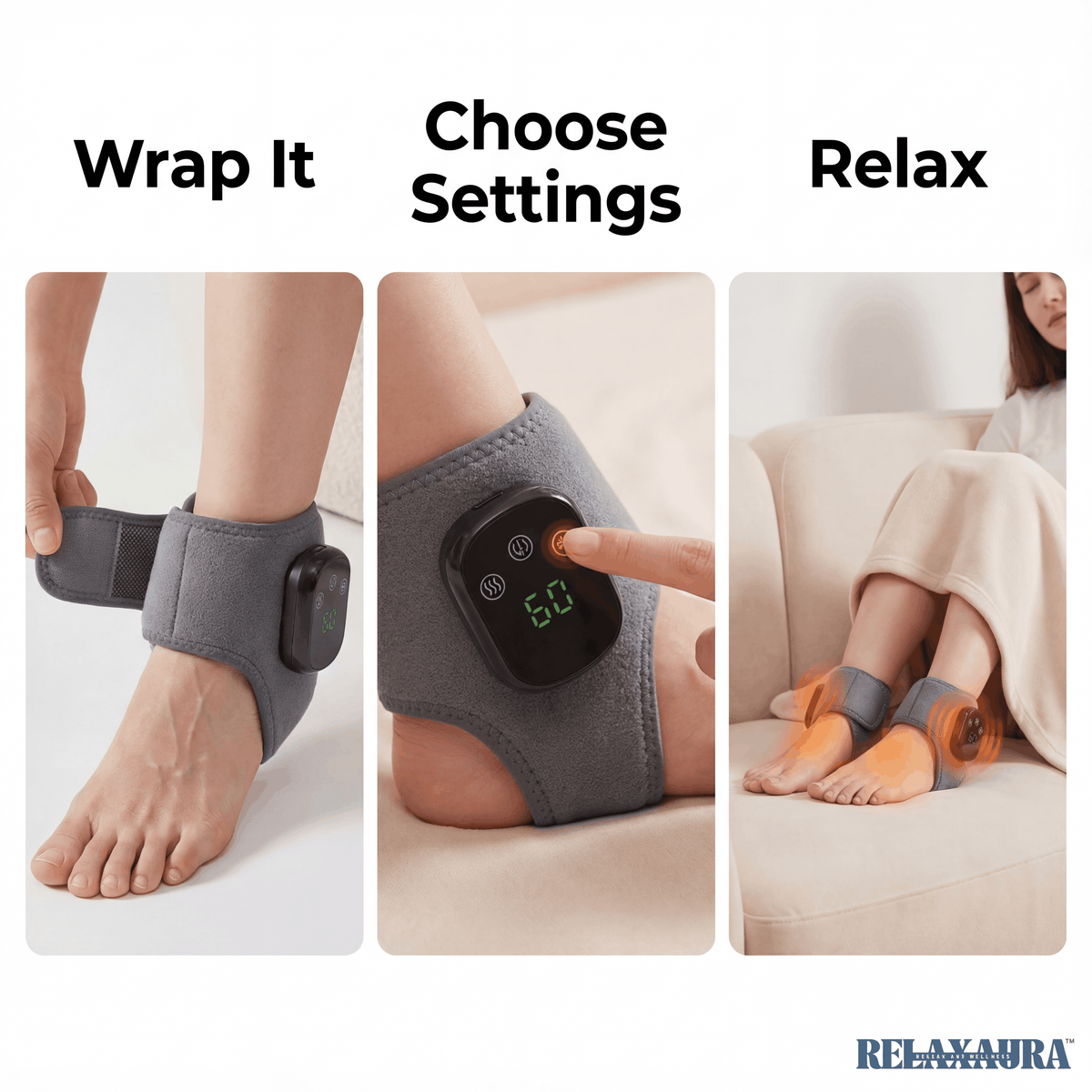 The RELAXAURA™ Foot Therapy Wrap uses 3-in-1 therapy: gentle heat, compression support, and therapeutic massage. These work together to boost blood flow, soothe tired muscles, and relieve foot pain — all in a natural, non-invasive way.